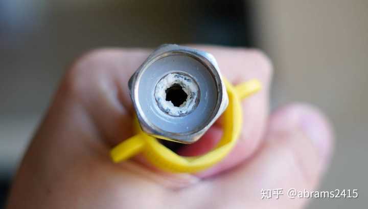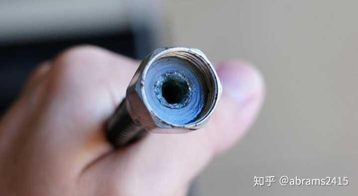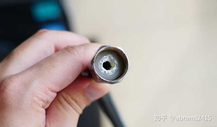 因为我家19年后就装了全屋中央软水,家里几乎找不到有任何水垢的地方。后来翻箱倒柜找到一根当年换下来的编织管。4分接口处有大量的白色碳酸钙(水垢),正好拿来试一试。