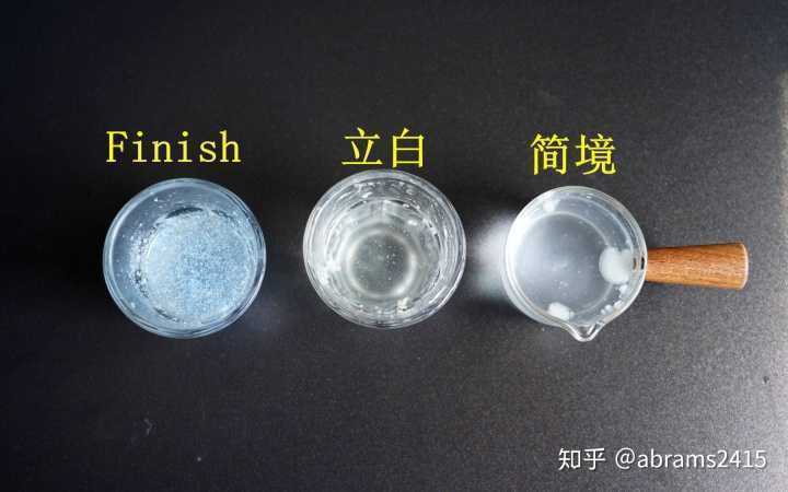 简境和立白平衡点机体清洁剂是固体。所以对于这两款我用20g里的5g加温水稀释的方式测pH值;而Finish是液体浓缩液,我就选择了250mL中的10mL加水稀释的方式测pH值(无法和其它两款比较,只做参考)