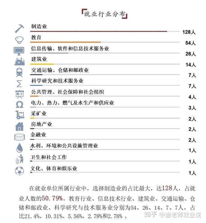 举例,中南大学,机械专业本科学生的就业去向,机械专业的学生选择就业的252人中,去软件及信息服务业26人,去制造业128人