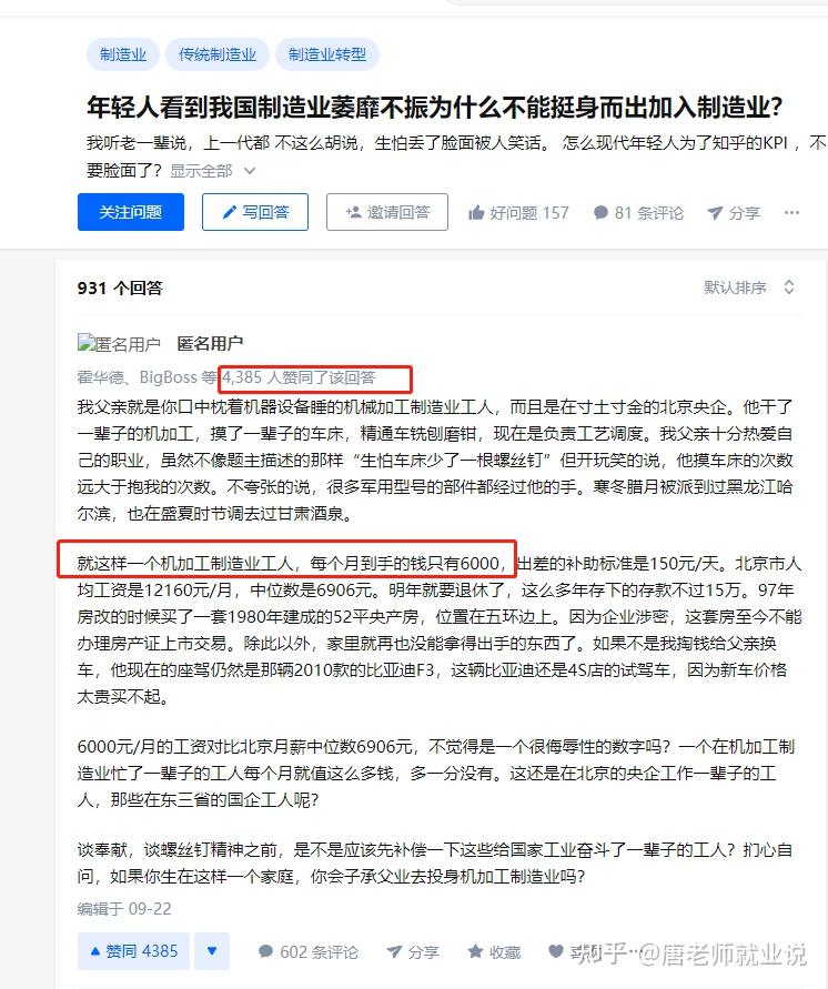 不知道我这个非机械专业的外行,讲的对不对,常去看看,黑机械专业,黑制造业,也就是我们的父辈经历了什么?为什么收入很低?我相信,一个答疑,4000人反对进入制造业是有他的道理,你要去找找这个道理和逻辑,你是不是认可?尤其是评论区