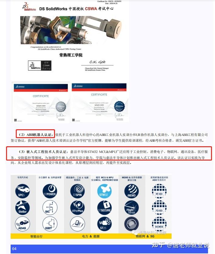 详细的解释可以看这个链接,但是从我截图来看,常熟理工学院的机械专业的学生,可以拿到ABB认证,也可以以拿到嵌入式工程技术人员的认证,进入工业控制、消费电子、物联网、通讯设备、医疗服务、安防监控等领域的。如果就业不了解,何谈考研的专业选择呢?