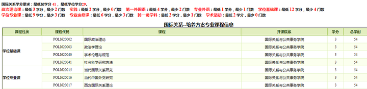 教学培养本专业硕士培养目标的官方版本是“坚持德、智、体、美全面发展的培养方针,通过对国际政治理论与历史知识、社会科学研究方法、学术规范伦理及相关专业理论知识的系统研究与学习,培养品学兼优,掌握坚实的国际政治理论和专门知识,具有较强的文字能力,能熟练运用外语(一门),具有从事本学科科学研究以及高等学校教学和涉外部门工作能力的专业人才。”根据这一目标,学生需要修完29学位学分的课程(见下表),其中第一外国语的两门4学分课程如果六级590(或托福100雅思7)以上可以申请免修(详见2016级复旦大学研究生第一外国语(英语)申请免修暂行实施办法);专业外语是所有学生必修的,过去学院专门开设“专业外语”课程,现在只要在复旦或外出交流期间修过一门等学分的全英文专业课程即可;