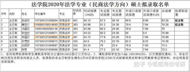 这里可以给大家举个例子,下面是民商法学的复试及录取名单,第二名录取考生为调剂录取,淘汰考生中重点标出的这名考生为一志愿报考,初试成绩381,但还是被刷掉了。总之,一志愿和调剂一起复试,对一志愿确实不算友好。